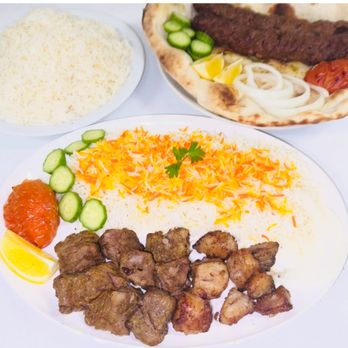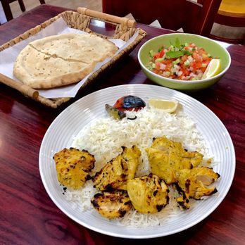 Char-grilled kabobs (chicken, beef, lamb) prepared fresh, served with rice or naan.