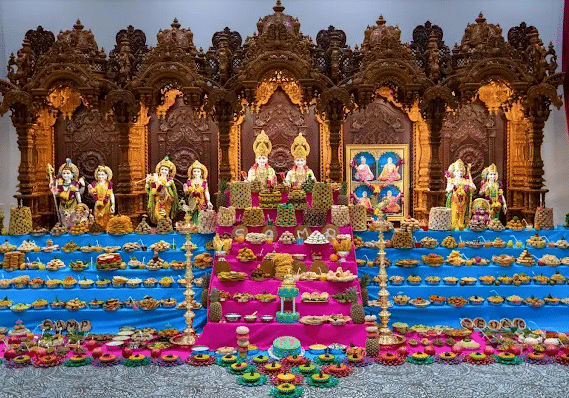 Deities: The central shrines house sacred images (murtis) of deities, including Bhagwan Swaminarayan, Gunatitanand Swami, Radha-Krishna, Sita-Ram-Hanumanji, and Shiv-Parvati-Ganeshji.