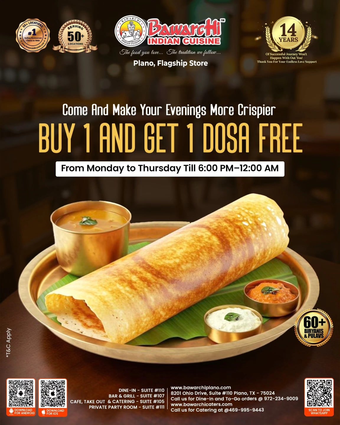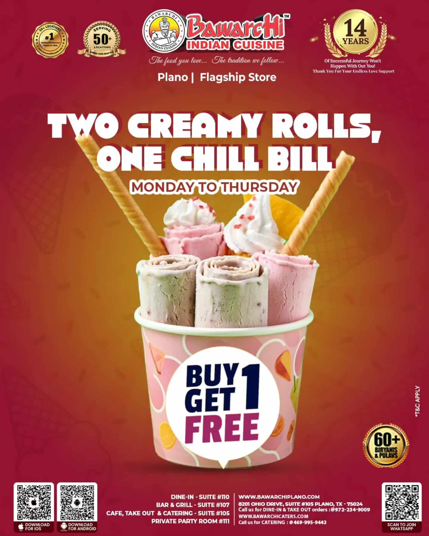 Bawarchi Biryanis – Plano offers a rich selection of traditional Indian dishes, with a focus on South Indian and Hyderabadi specialties. Their menu features popular items like Lamb Chop Biryani, Natukodi (Country Chicken) Biryani, and Paneer Pulao. The restaurant is also know for its eggless pastries, including mango and chocolate cakes. While many customers praise the food quality and service, some have reported inconsistencies in food preparation and cleanliness.