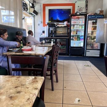 >A cozy yet lively atmosphere: modest interior in a strip‑mall location, with local regulars lining up and colourful décor like a wall of dollar bills from over 150 countries.