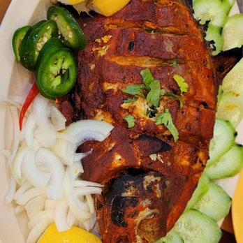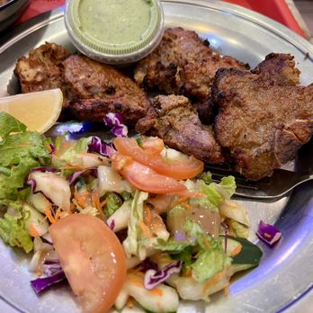 >A grill and tandoor section featuring sizzling kebabs, including ground‑meat mixes and marinated chunks, served with warm naan and bold sauces.