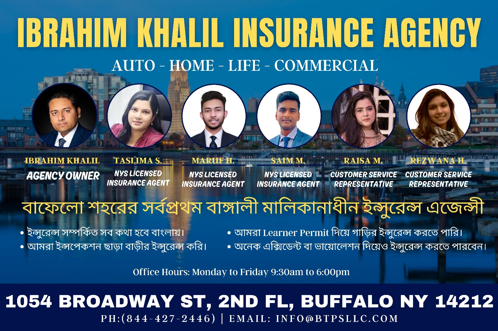 Ibrahim Khalil Agency LLC is a professional insurance brokerage based in Buffalo, New York, dedicated to providing comprehensive and personalized insurance solutions for individuals, families, and businesses. Specializing in auto, home, commercial, and business insurance, our agency helps clients find coverage that fits their needs, budget, and lifestyle. We pride ourselves on offering expert guidance, competitive rates, and fast claims support, ensuring peace of mind and protection for everything that matters most.
