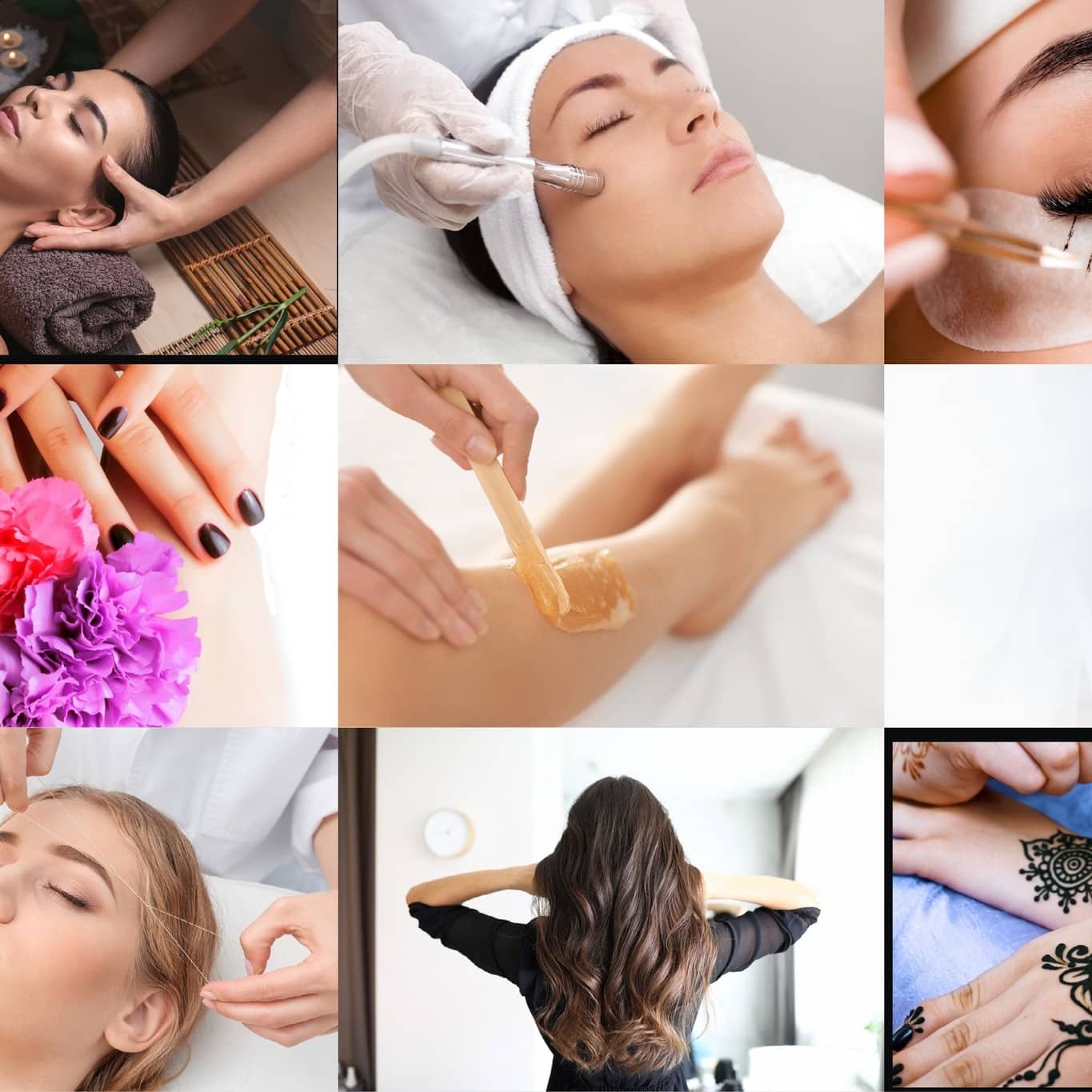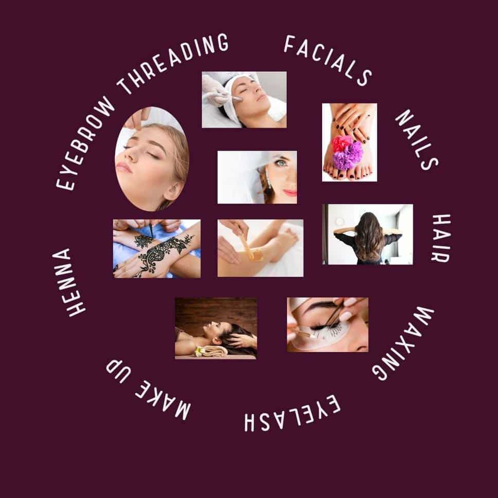 Services include: Haircuts, Hair Coloring, Eyebrow Threading, Waxing, Facials, Nails, and Skincare