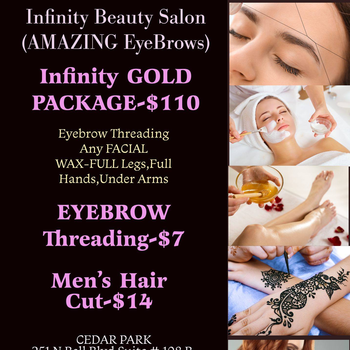 Discover your most confident, radiant self at Infinity Salon, where beauty meets perfection. Our experienced stylists and estheticians specialize in haircuts, coloring, facials, eyebrow threading, waxing, manicures, pedicures, and skincare treatments designed to enhance your natural beauty.