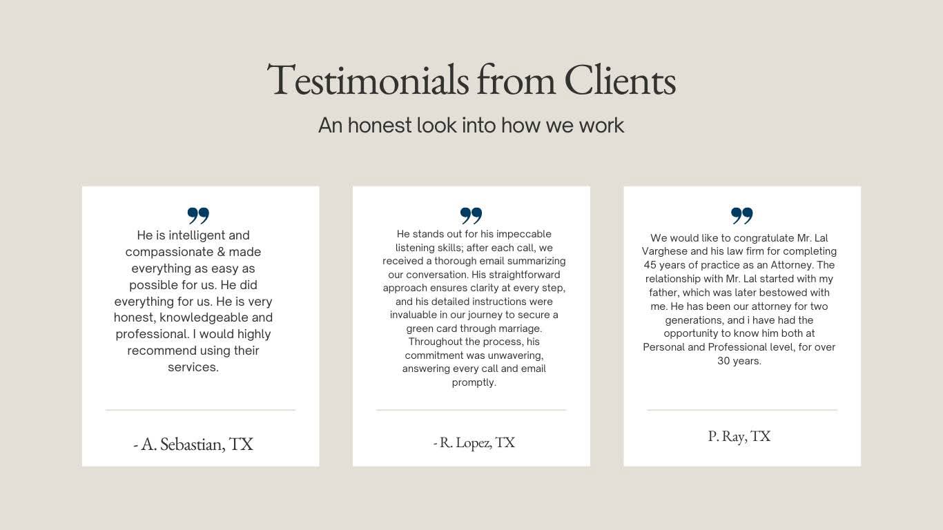 Attorney Lal Varghese is a trusted immigration lawyer in Irving, TX. With over three decades of experience guiding individuals and families through the complexities of U.S. immigration law. Fluent in English, Hindi, Gujarati, Malayalam, and Tamil, he offers personalized legal solutions with a deep understanding of cultural nuances. As a founding member of the Texas Chapter of the American Immigration Lawyers Association (AILA), he is committed to excellence. And client satisfaction. Whether you're seeking a work visa, family reunification, or religious worker status, Attorney Varghese provides expert legal counsel to help you achieve your American dream.