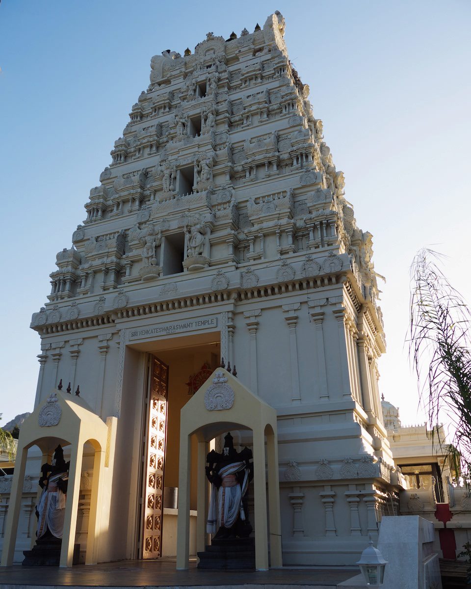 Dravidian architecture: The temple was construct in 1981 by artisans from Southern India . Adhering to the traditional Dravidian-style architecture.