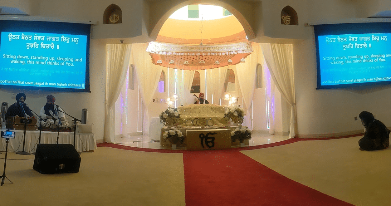 Daily worship (Kirtan): The gurdwara holds regular services throughout the week, centered around kirtan (the singing of hymns from the Guru Granth Sahib). The shabads (hymns) are displayed on-screen with English translations for all to understand.