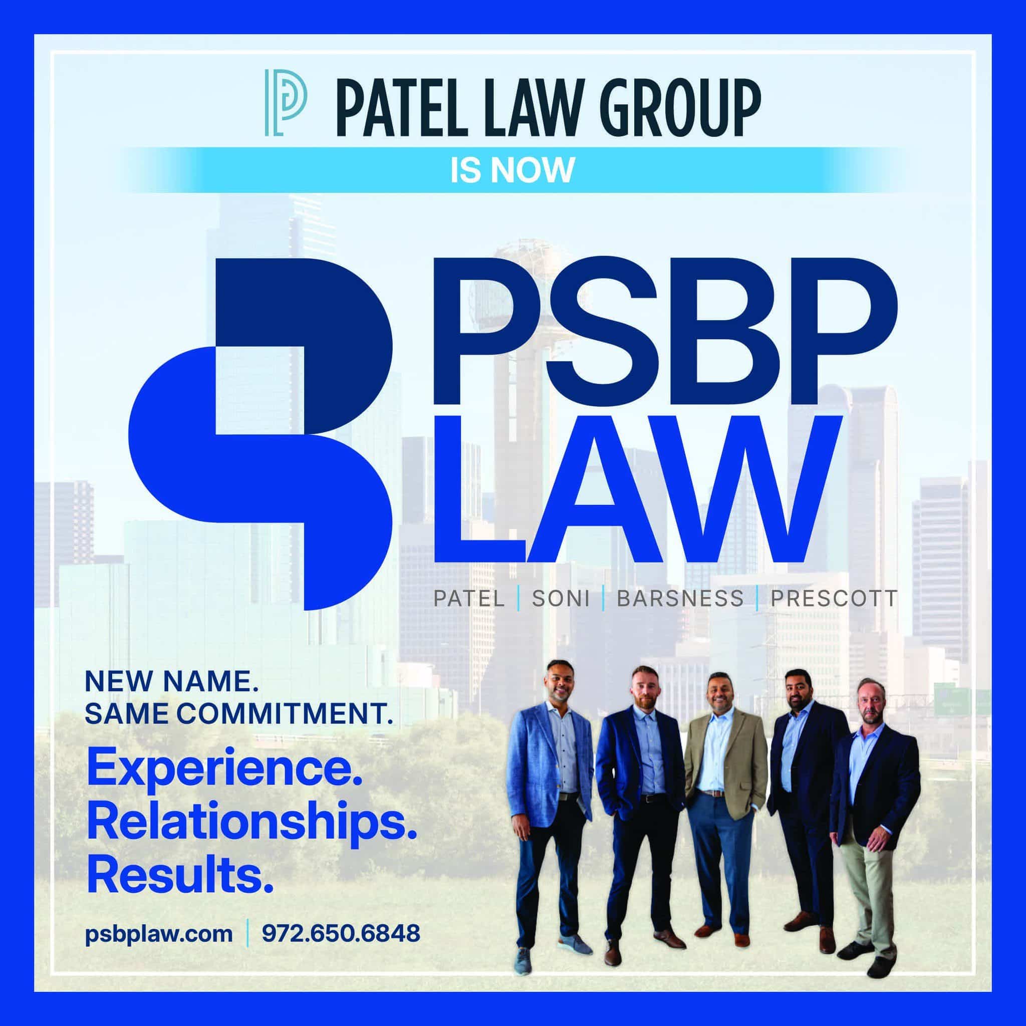 PSBP Law, formerly known as Patel Law Group, additionally, is a boutique law firm based in Irving, Texas, that serves clients across the Dallas–Fort Worth metroplex and nationwide. The firm rebranded to PSBP Law, also called Patel, Soni, Barsness & Prescott.