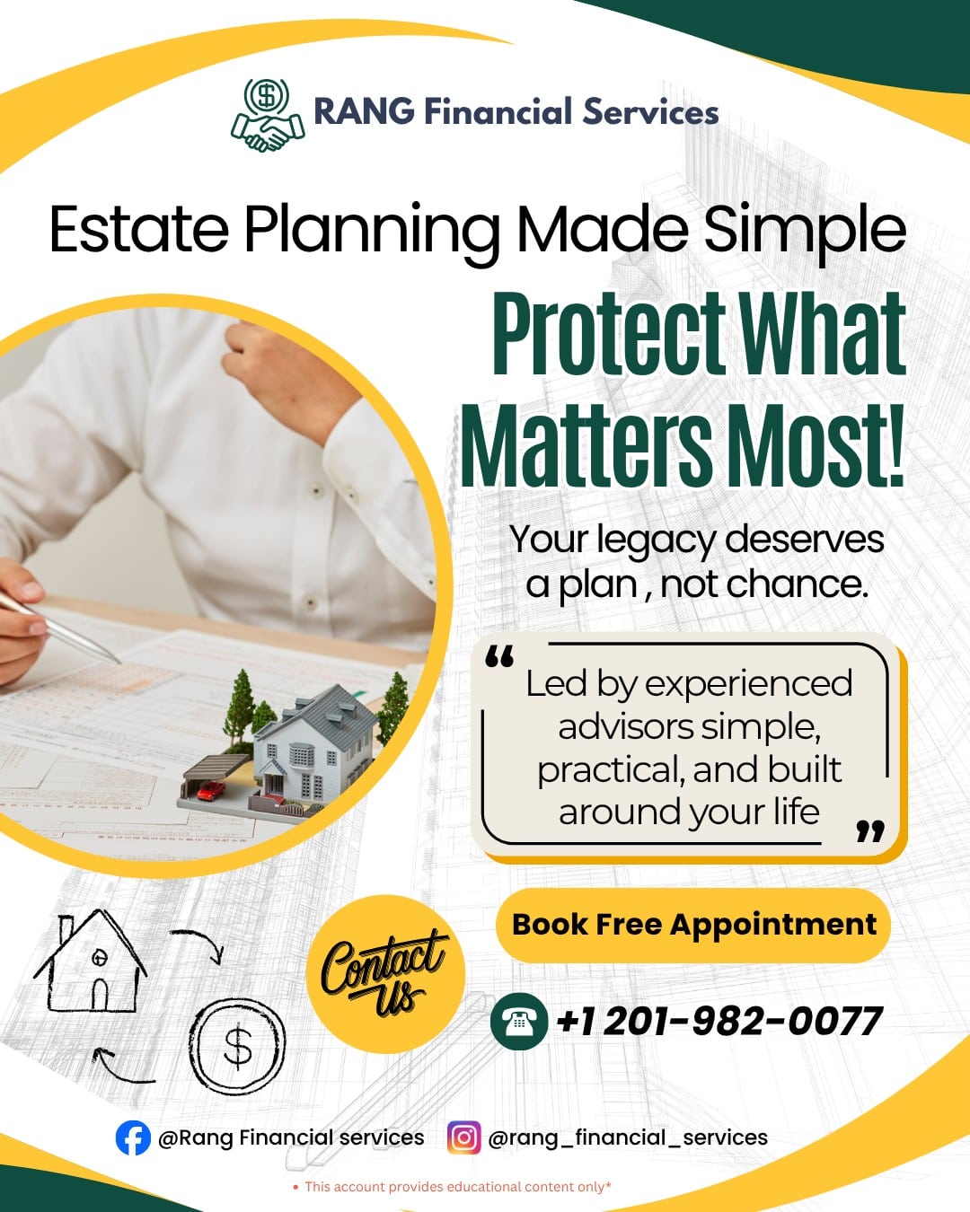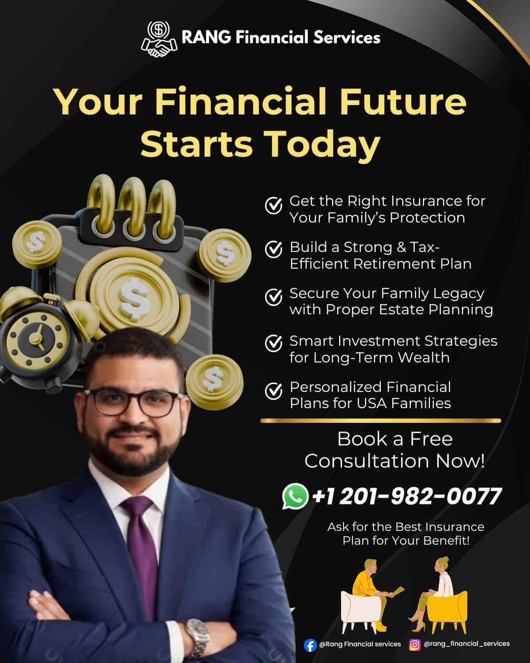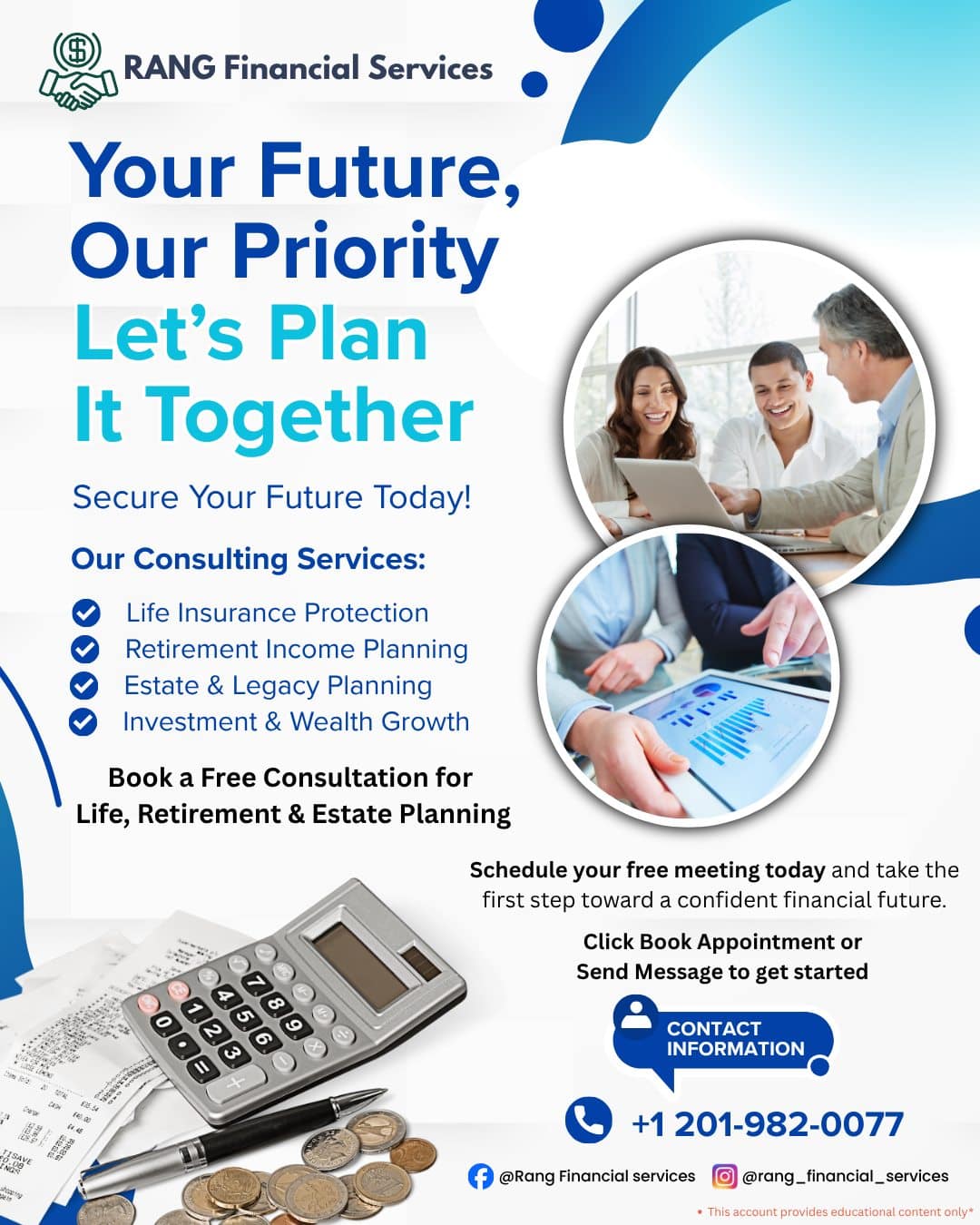 Rang Financial Services believes in empowering clients through education. That’s why we provide free financial webinars, one-on-one consultations, and simplified guidance to help you make informed decisions about your financial future. Whether you’re planning for retirement, protecting your family with reliable life insurance coverage, or preparing your estate for the next generation, our experienced advisors are here to support you every step of the way.