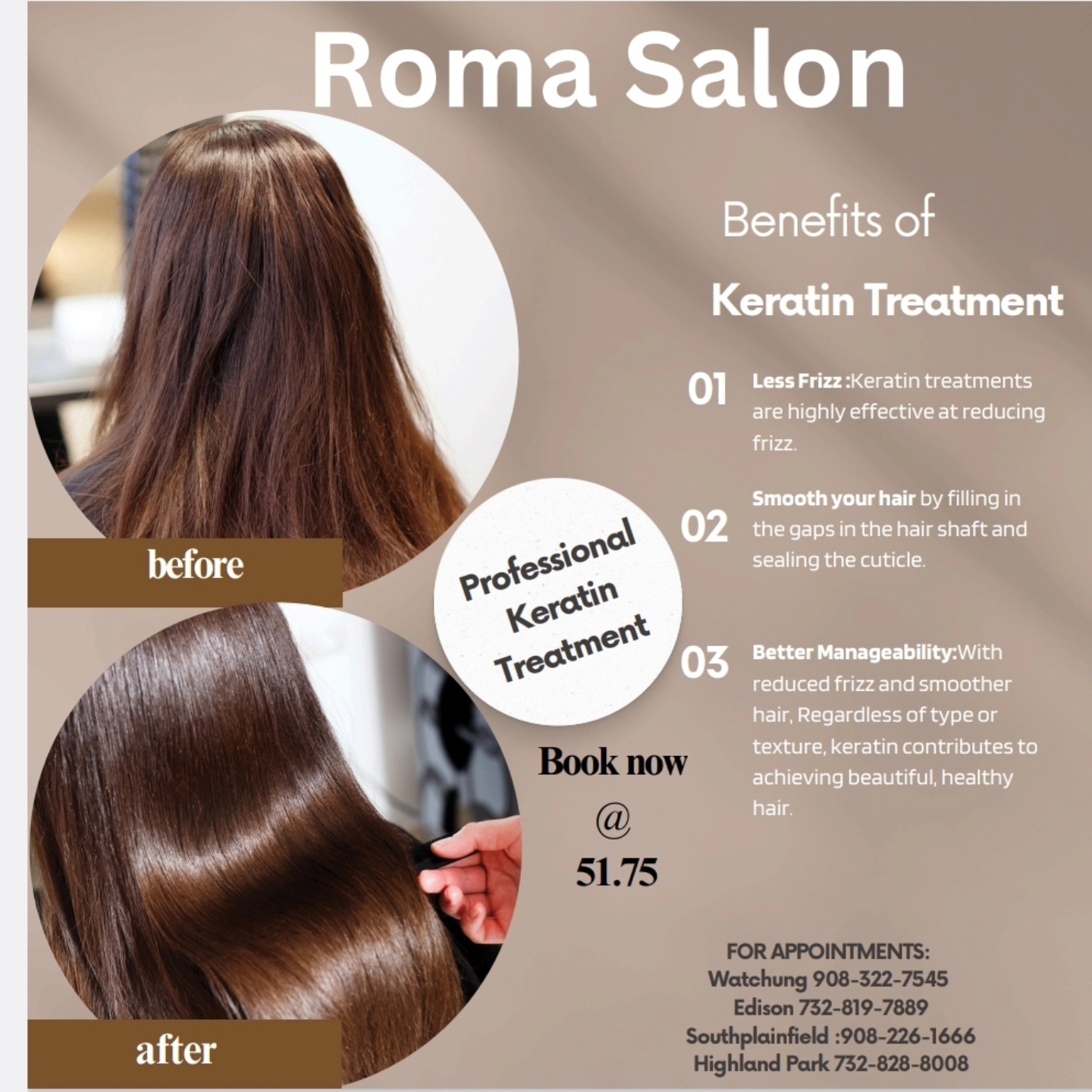 Roma Beauty Salon, with multiple locations across New Jersey, offers a premium hair and beauty experience tailored to your unique style. Our expert stylists specialize in trendy haircuts, balayage, highlights, hair extensions, and keratin treatments to rejuvenate and transform your hair. Beyond hair, we provide professional eyelash extensions, facials, skincare, waxing, threading, and bridal or party hair and makeup services. At Roma Salon, every visit is designed to leave you feeling confident, radiant, and pampered. Discover luxury, personalized care, and a welcoming atmosphere at Roma Beauty Salon – your ultimate destination for beauty and self-care.