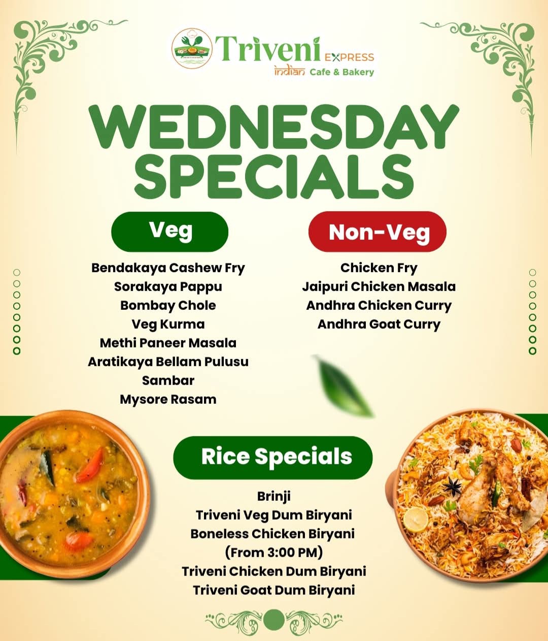 At Triveni Express, we bring the rich culinary heritage of Southern India to your table. Our menu boasts a variety of flavorful dishes, from aromatic biryanis to crispy dosas, all crafted with the freshest ingredients and authentic spices. Whether you're craving a hearty meal or looking to stock up on essential groceries, our store has you covered. Experience the warmth and hospitality of India, right in your neighborhood.